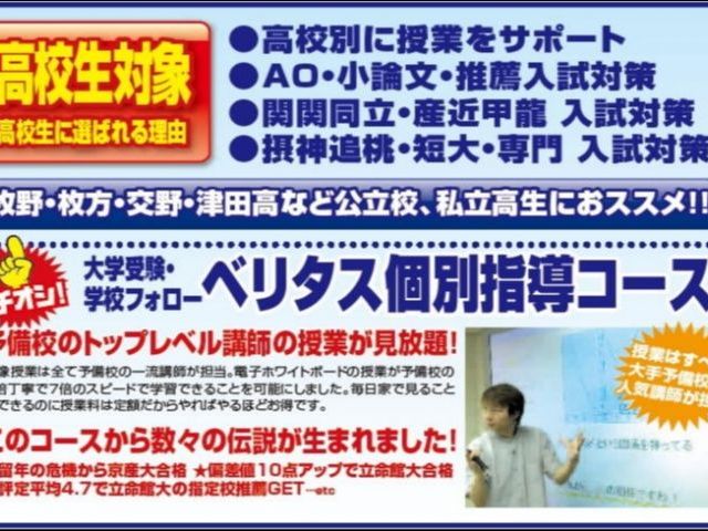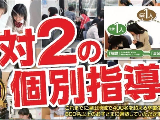 「津田・杉・交野二中」・「牧野・枚方・交野・枚方津田高」・「津田南・津田・倉治小」など、小4〜高3生を対象とした1対2人の個別指導専門塾です。